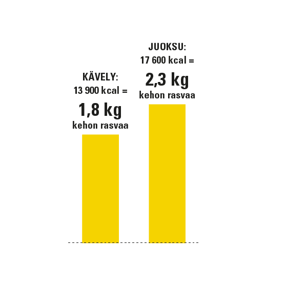 Kun kävellään tai juostaan 5 kilometriä kolmesti viikossa vuoden aikana ja energiansaanti pysyy vakiona: