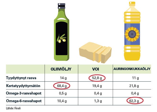 Taulukko oliviiviöljyn, voin ja auringonkukkaöljyn sisältämistä rasvoista: