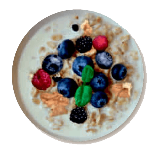 1–1,5 dl kaurahiutaleita maidon tai kasvijuoman kanssa, reilu kourallinen marjoja ja 3–4 saksanpähkinää rouhittuna.