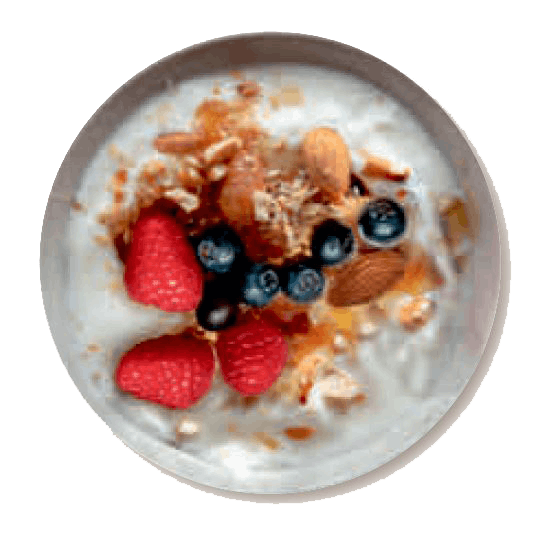 3 dl kefiiriä ja 100 g marjoja, 15–20 rouhittua mantelia ja pieni tilkka akaasiahunajaa.