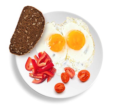 2 paistettua munaa (1 tl oliivi- tai rapsiöljyä paistamiseen) ja viipale täysjyväruisleipää, pari kirsikkatomaattia ja punainen paprika.