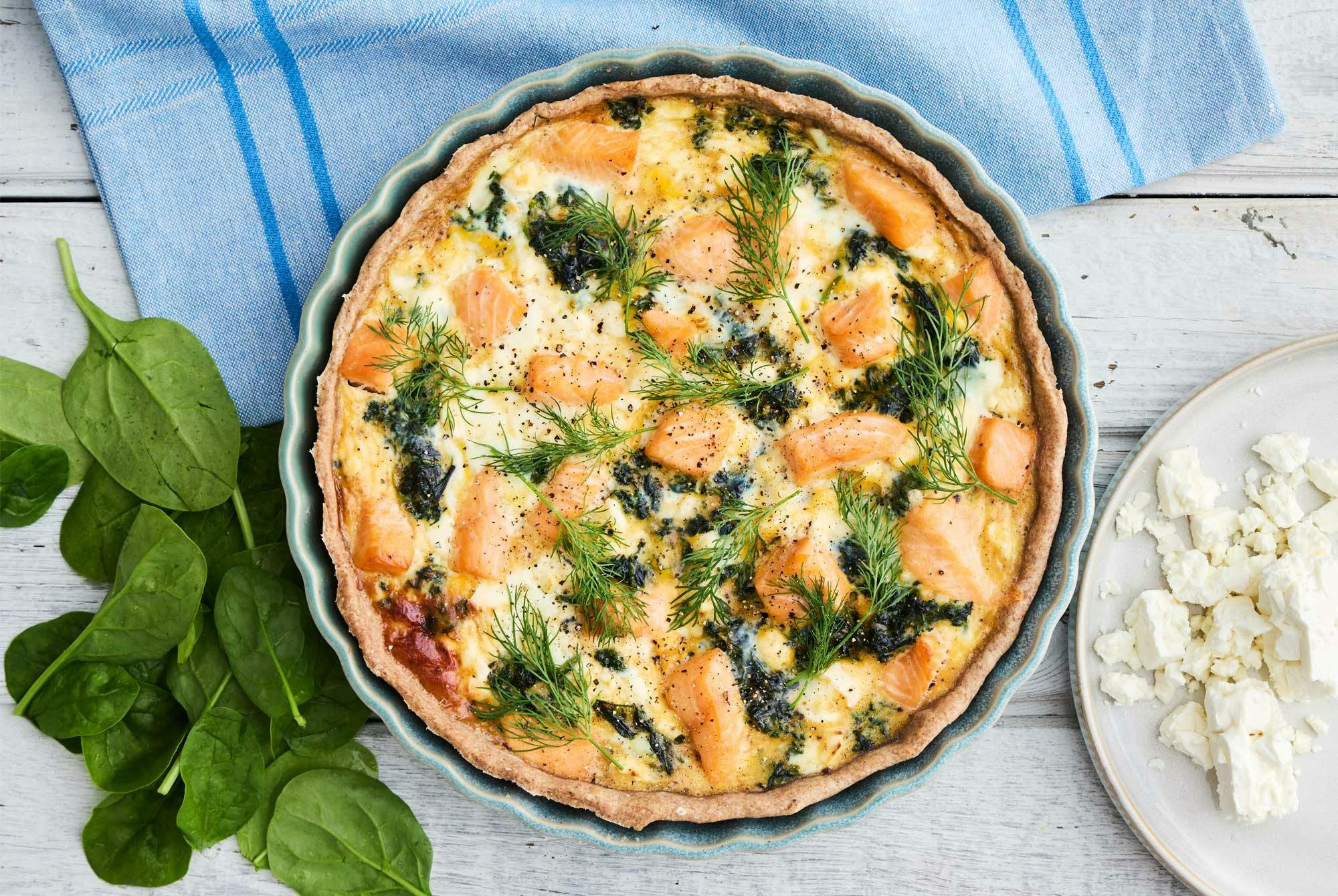Terveellisiä reseptejä Päivällinen Lohi-pinaa... Lohi-pinaattipiiras 40 minuuttia 563 kcal Tämä lohipiiras vie kielen mennessään! Pinaatti tuo piirakkaan miedon maukasta makua sekä runsaasti vitamiineja, kivennäisaineita ja raikasta väriä. Teksti: Signe Moesby Leth 5. helmikuuta 2026 PIIRAS – Lohen tilalla voi halutessaan käyttää myös muuta proteiinin lähdettä maun mukaan. © wichmann+bendtsen Lohi-pinaattipiiras Ainekset Valmistus Tosiasiat Lisää suosikkeihin Poista suosikeista Pidä näyttö päällä Ainekset 2 annosta 50 g vehnäjauhoja 50 g grahamjauhoja ½ tl merisuolaa mustapippuria myllystä ¼ dl ekstraneitsytoliiviöljyä ½ dl vettä Täyte: 1 lohifileetä (noin 225 g) 150 g pakastepinaattia sulatettuna 37 g fetaa 2½ kananmunaa 1 dl maitoa merisuolaa mustapippuria myllystä ripaus hienoksi raastettua muskottipähkinää Valmistus Lämmitä uuni 175 asteeseen (kiertoilma). Sekoita jauhot, suola ja pippuri. Pane toiseen kulhoon öljy ja vesi. Lisää sekaan jauhoseos vähän kerrallaan vaivaten. Kaulitse taikina ja muotoile piirakkapohjaksi. Painele pinaatista neste. Levitä pinaatti, murennettu feta ja paloiteltu lohi piirakkapohjalle. Sekoita munat, maito, suola, pippuri ja muskottipähkinä ja kaada täytteiden sekaan. Kypsennä noin 30 minuuttia tai kunnes munamassa on hyytynyt ja pohja on saanut kullankeltaisen värin. VinkkiSulata ja valuta pinaatti huolella, jotta piiraasta ei tule vetistä. PinaattiLohiMuna