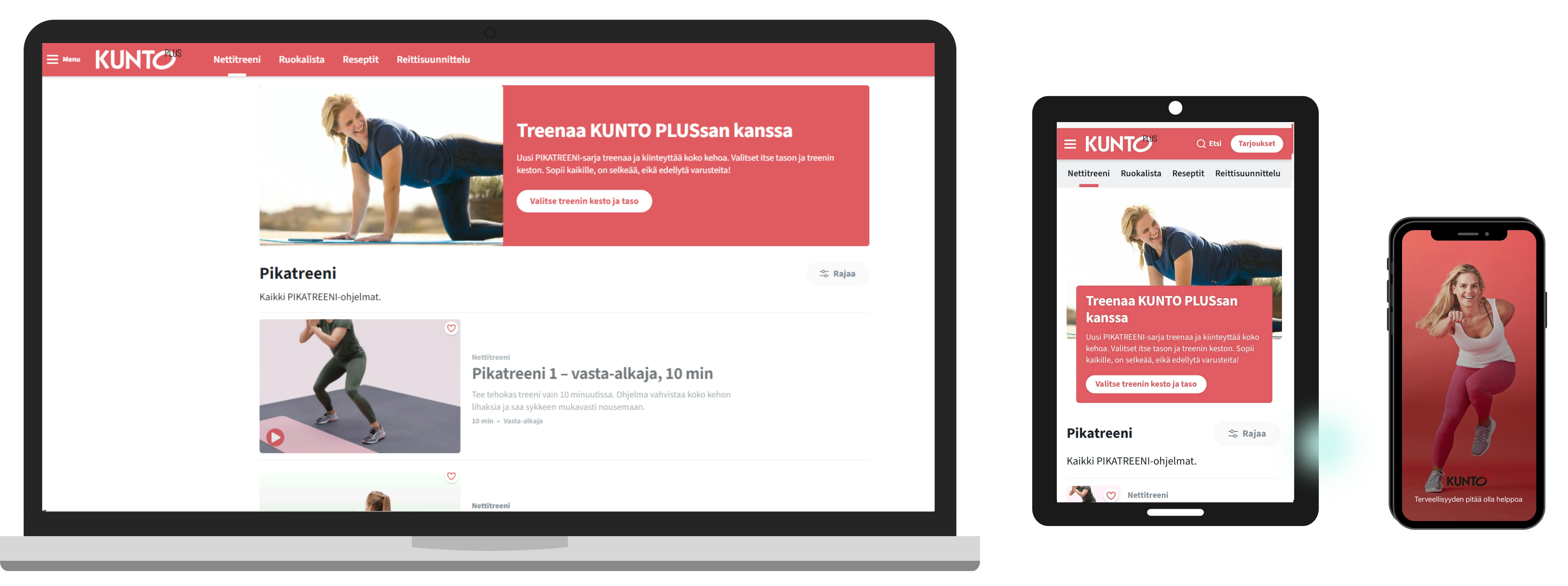 KUNTO PLUSsan tilaajana saat viikon ruokalistat ja treenivideokirjaston koko tarjonnan ja voit jatkossakin valita sieltä itsellesi sopivat treeniohjelmat, saat edelleen ateriaehdotukset viikoittain ja sivuston ja sovelluksen sadat terveelliset reseptit ovat käytössäsi.