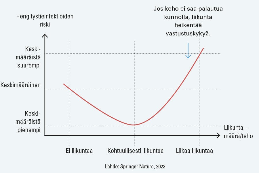 Tämä tarkoittaa, että (suhteellisen rankan) liikunnan jälkeen elimistö havaitsee tunkeutuvat mikrobit nopeammin ja torjuu ne tehokkaammin.