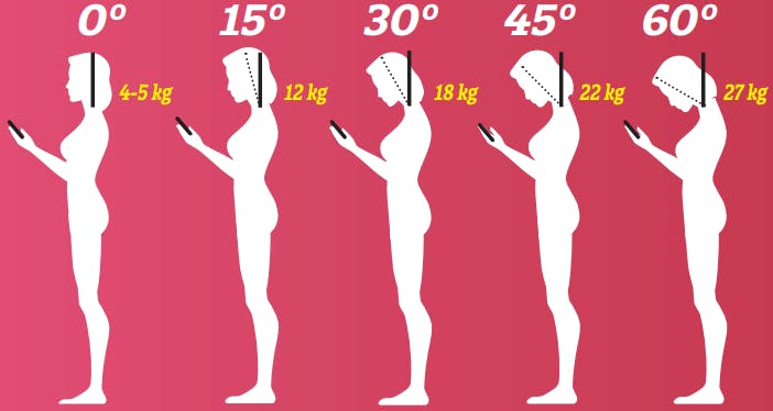 Kun taivutat päätä alaspäin katsoaksesi puhelinta tai tablettia, lisäät painetta niskaan. Ohessa kuva paineen kilomääräisestä vaikutuksesta.