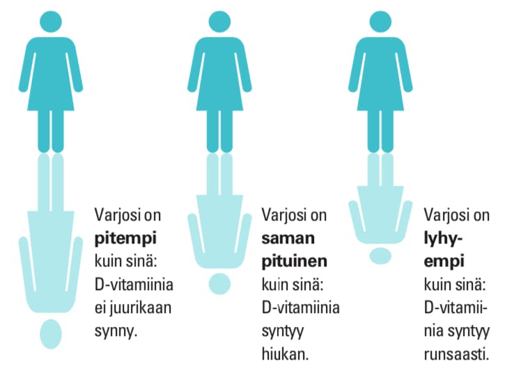 - Olet tummaihoinen – Tummassa ihossa on enemmän väriainetta, melaniinia, joka hidastaa D-vitamiinin muodostumista, koska se suojaa auringolta.