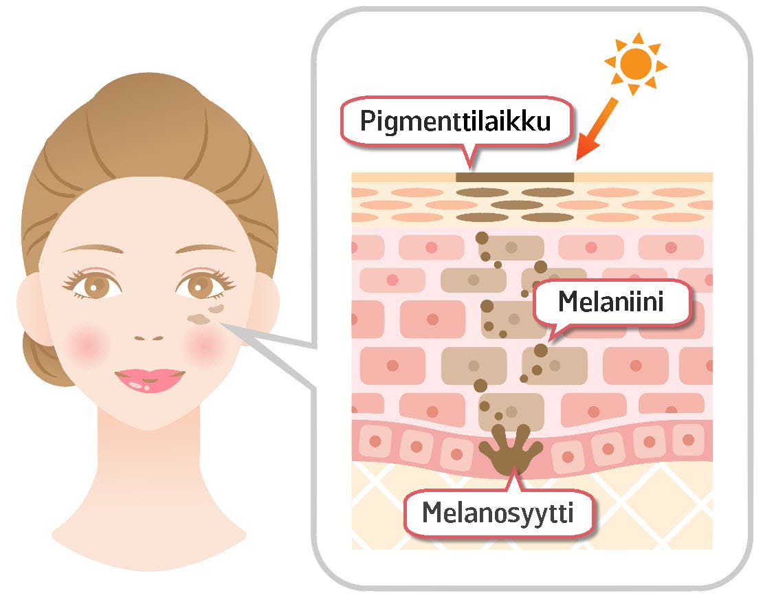 Niin se vain on. Jos ei ihoa suojaa auringolta, pigmenttisolut eli melanosyytit alkavat iän myötä tuottaa pigmenttiä epätasaisesti niillä ihon alueilla, jotka ovat useimmin alttiina auringolle, siis kasvoihin, kaulaan, kämmenselkiin ja olkapäihin.