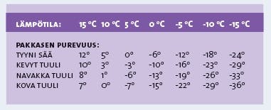 Taulukosta näet pakkasen ja tuulen yhteisvaikutuksen: