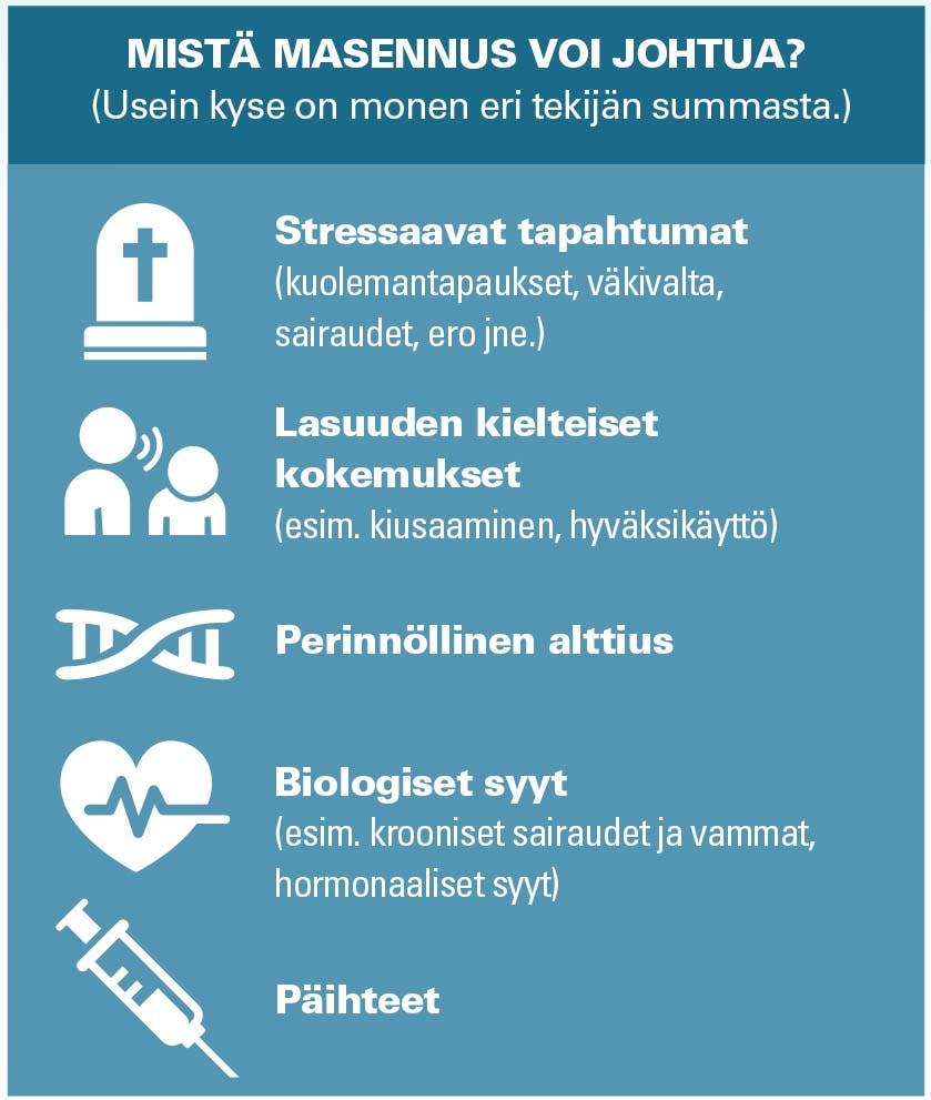 Niina Markkulan ja Jaana Suvisaaren vuonna 2017 tekemän tutkimuskatsauksen mukaan masennustaipumus on jossain määrin periytyvää, mutta ympäristöllä on enemmän merkitystä kuin perinnöllisellä alttiudella.