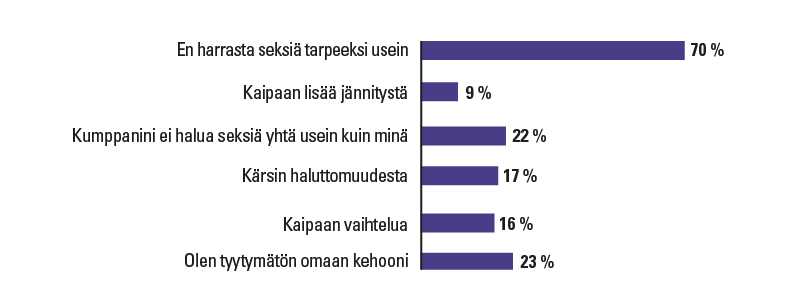 Vuosia yhdessä olleilla paris- kunnilla osapuolten halukkuus seksiin vaihtelee miltei väistämättä jossakin vaiheessa. Vaihtelut eivät myöskään osu useinkaan yksiin. Joka kymmenes kokee myös fyysisiä haasteita seksin saralla.