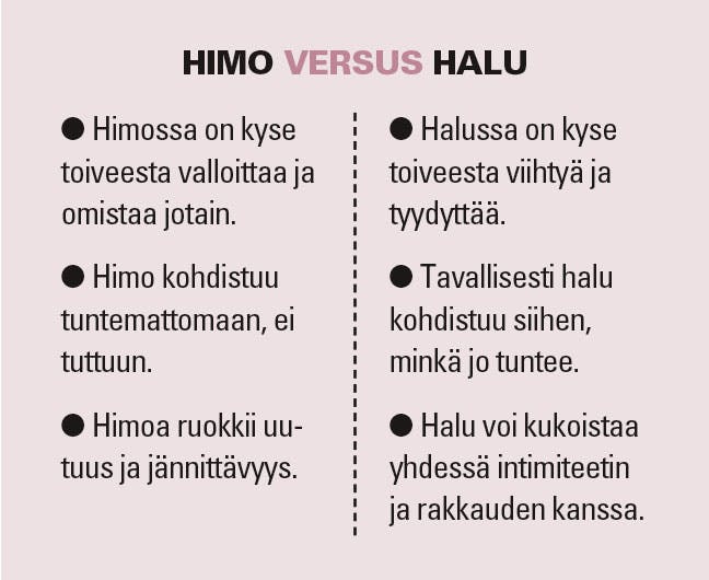 Vaikka halujen epätahtisuus on näinkin tavallinen haaste, voi keskustelun avaaminen aiheesta tuntua pelottavalta ja kipeältä. Kun jotakuta rakastaa, häntä automaattisesti myös haluaa – eikö niin? Itse asiassa ei. Halu ja himo ovat itsevaltaisia tunteita, jolla ei aina ole mi- tään tekemistä rakkauden kanssa.