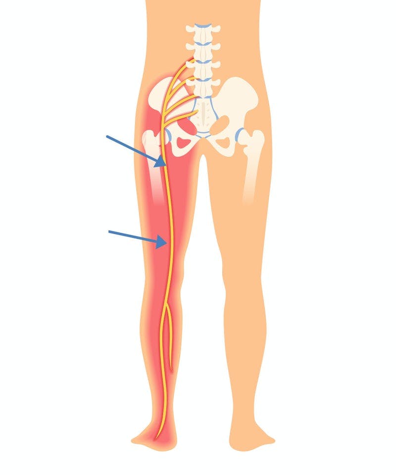 Iskiashermo kulkee tässä. Se on kehon pisin hermo, joka kulkee lannerangasta jalkoja pitkin aina jalkateriin asti.