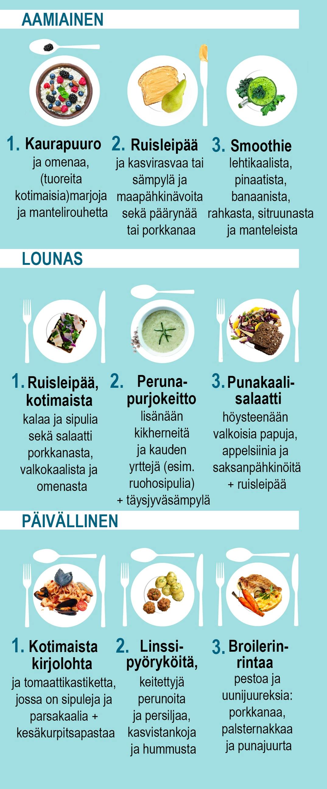 Jos pelkkä ajatuskin ruuan ilmastovaikutusten pohtimisesta väsyttää, ei hätää, sillä jos syöt suhteellisen terveellisesti, on aterioidesi ilmastokuormitus todennäköisesti pienehkö. Terveellisellä ruualla tarkoitetaan tässä ruokavaliota, jossa syödään runsaasti kasviksia ja hedelmiä ja vain vähän lihaa. Jos olet valmis säätämään aterioitasi ilmastolle suotuisampaan suuntaan, kerromme, mitä kannattaa lisätä lautaselle ja mitä ilmastoa kuormittavia ruokia jättää pois. Esittelemme myös ilmastoystävälliset ateriat – ja kolme ilmastoa kuormittavaa ateriaa.