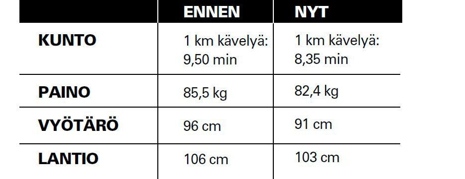 – Kävelyllä on ollut merkittävä vaikutus mielialaani. Huonoina päivinä liikkeelle lähteminen on piristänyt aivan selvästi. Olen ylipäänsä ollut paremmalla tuulella ja saanut paljon lisää energiaa. Etenkin rankemmat treenipäivät antavat puhtia. Vaikka harjoitteluun menee aikaa, minusta tuntuu, että saan silti enemmän aikaiseksi, koska jaksan enemmän. Aikaisemmin väsähdin aina jo iltapäivästä enkä jaksanut tehdä oikein mitään töiden jälkeen. Myös makeanhimo on lähes kadonnut – parin viikon jälkeen en vain enää kaivannut mitään makeaa.