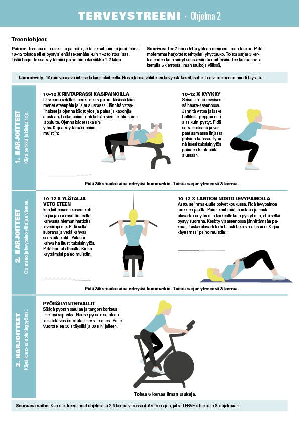 Kun olet treenannut ohjelmalla 2–3 kertaa viikossa 4–6 viikon ajan, jatka TERVE-ohjelman 3. ohjelmaan.