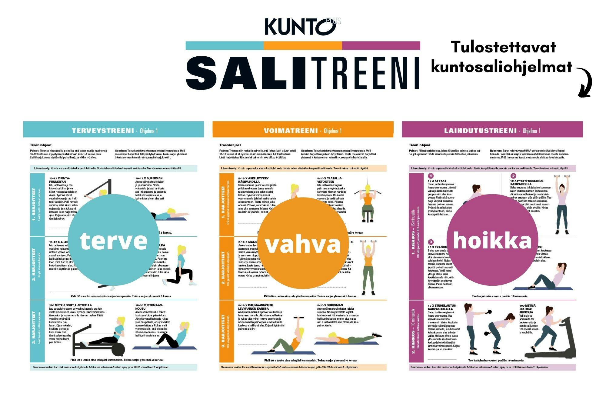 Kaipaatko opastusta kuntosalitreeniin? Kokeile KUNTO PLUSsan räätälöityjä tavoiteohjelmia, jotka on helppo tulostaa ja ottaa salille mukaan. Tämän helpommaksi ei tavoitteellinen treeni muutu!