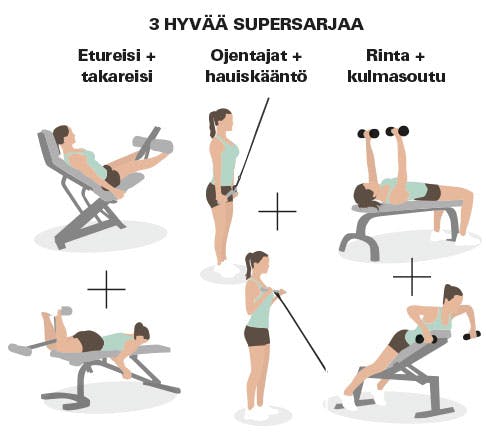 Supersarjoissa tehdään kaksi harjoitetta peräkkäin ilman taukoa. Teet siis ensin yhden sarjan harjoitetta 1 ja heti perään yhden sarjan harjoitetta 2 ja pidät vasta niiden jälkeen pienen tauon.